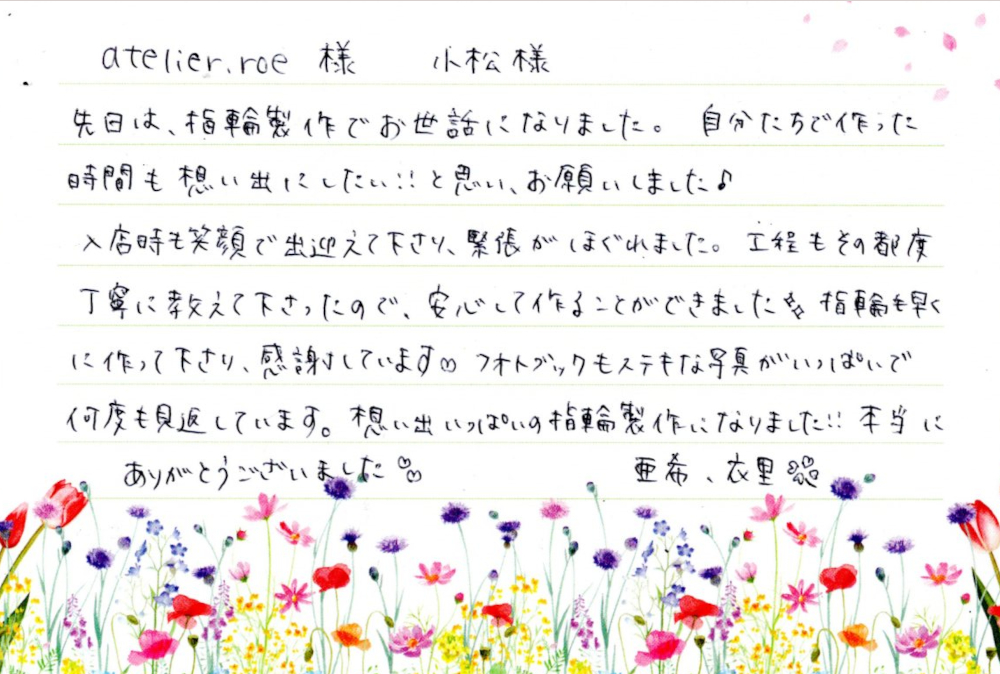 大阪府吹田市/ 手作り結婚指輪 山下 & 舛田 様よりお手紙が届きました。